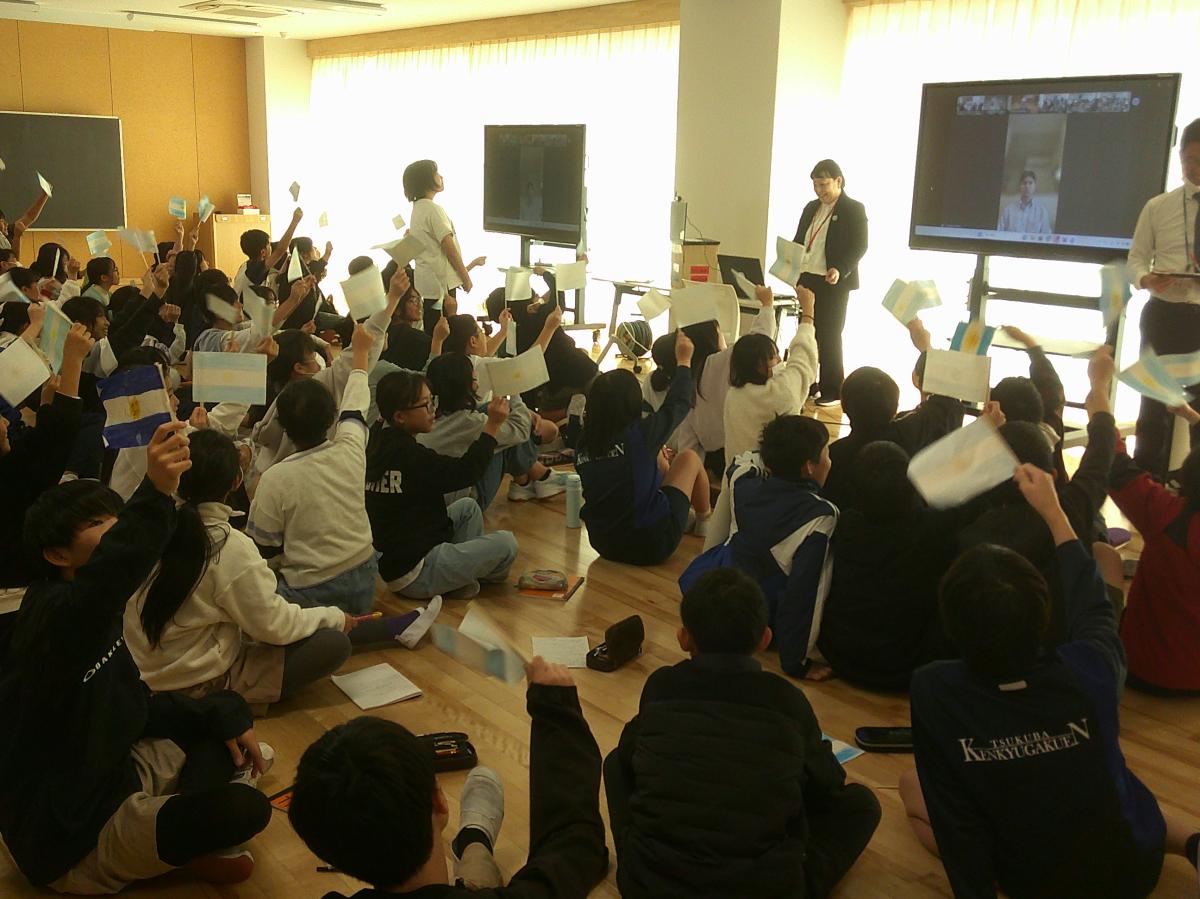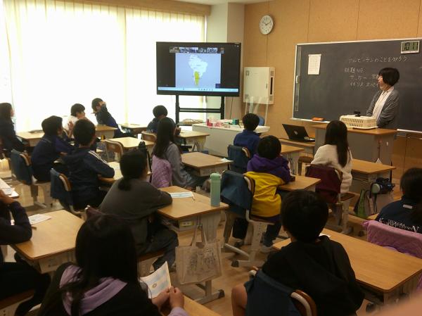 10月29日、5・6年生を対象に国際理解集会を開催しました。ALTの先生とアルゼンチン大使館員の方をオンラインで迎え、アルゼンチンの歴史や文化、外交官の仕事について分かりやすく紹介していただきました。児童は事前に質問を準備し、積極的に発言。手作りのアルゼンチンの旗を振って元気に挨拶するなど、会場は温かい雰囲気に包まれました。画面越しに広がる世界に目を輝かせながら、異文化に触れる貴重な時間となりました。
