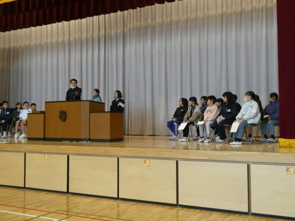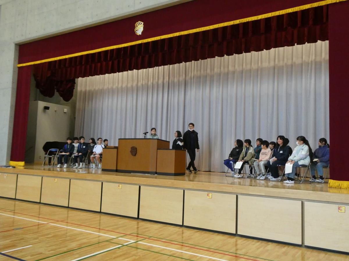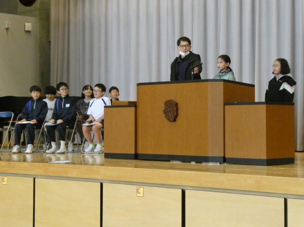 本日、児童会選挙に向けた立会演説会のリハーサルを行いました。立候補者と応援演説者が、本番と同じ流れで演説や入退場の確認をしました。
