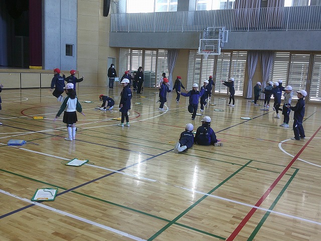 1年生が体育で楽しそうに縄跳びの練習をしています。本校では全学年で「なわとび検定」に取り組んでおり、自分の目標を決めて挑戦し、できることを少しずつ増やすことがねらいです。検定の日には、高学年が記録を数えたり励ましたりしてくれるため、1・2年生も安心してチャレンジできます。今日も全員が意欲的に取り組んでいました。