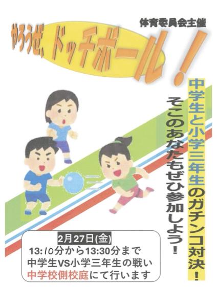 昼休み、中学校側の校庭で、中学生の有志と小学3年生がドッジボールを楽しみました。中学校の体育委員会が主催してくれた取り組みで、みんな真剣そのもの。