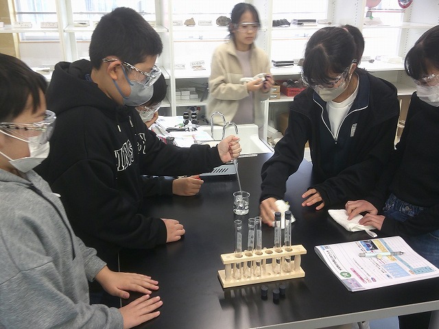 理科で、食塩水・アンモニア水・塩酸・重そう水・炭酸水の5種類を調べる実験を行いました。どれも透明ですが、においの違いや、熱したときの反応などを確かめながら、その性質を比べました。本格的な実験に、子どもたちはわくわくしながら取り組んでいました。