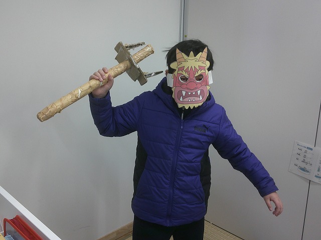 節分にちなんで、豆まきした学級がありました。子どもたちは鬼のお面をつけ、「鬼は外、福は内!」の元気な声とともに、楽しく豆まきをしました。