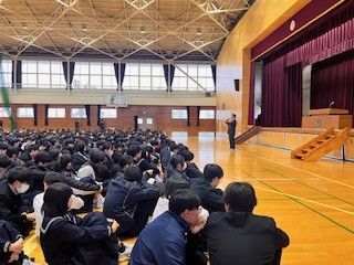 今年最後の全校集会を行いました。その中で、生徒会役員の新旧交代式が行われ、生徒会長より、「幸せな学校づくりのために、みんなで考えたり、話し合ったりして、より良い大穂中学校を作ることができた。」と話がありました。本当に一人一人が主役となれる、よい学校だということを感じています。