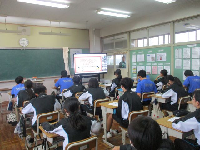 毎年実施しているスマホ・SNS安全教室ですが、今年もNTTドコモさん協力のもと全クラスでオンライン授業を実施しました。情報を活用する際の、自分自身の行動にともなうリスクを考え、友達と意見交換しながらリスクへの向き合い方と対処方法について、学ぶことができました。実生活に生かしていってほしいです。