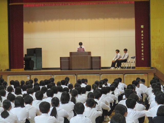 本日(10日)、1学期の終業式が行われました。終業式では、各学年の代表生徒が1学期の振り返りと2学期の抱負を発表しました。来週からは2学期がスタートします。1学期で培った力を発揮して、さらによりよい学校生活を送っていってほしいと思います。