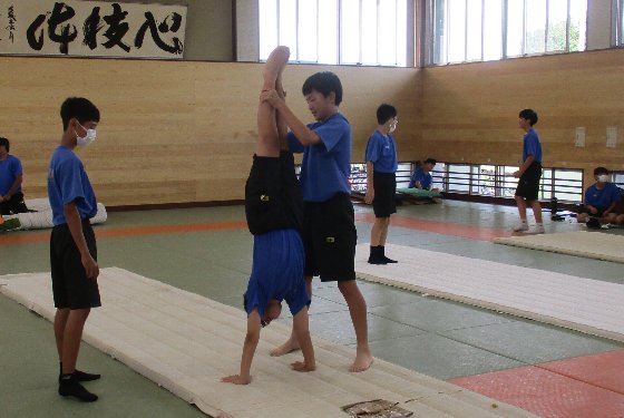 7年生の保健体育では、現在器械運動に取り組んでいます。マット運動の連続技に挑戦し、友達とペアになって、お互いに補助をしたり、アドバイスをしたりしながら上達を目指しています。日常生活ではなかなか体験できない回転運動を成長期に体験しておくことが、今後の身体能力の向上につながると思いますのでしっかり練習していきましょう。