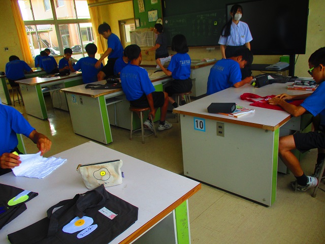 8年生の家庭科の授業でエコバックを作成しました。今日は、お互いの作品の良さを認め合い、鑑賞し合うことができました。それぞれ工夫したポイントがあり、個性あふれる作品が仕上がっています。2階の通路に展示してありますので、休み時間にぜひ見に来てみてください。