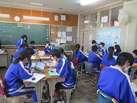8年生の社会科では中央高地の産業の特色について、グループで話し合いをしていました。農業、商業、観光など分担しながらその特色をまとめていました。