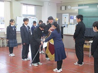 冬休みに入るのを前に、オンラインにて全校集会が実施されました。集会では秋から今までに行われた部活動の大会やコンクール、作品等の表彰式をおこないました。その後は生徒会役員の任命式と引継ぎ式です。現生徒会長から新生徒会長へ校旗が手渡されました。