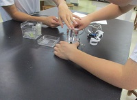 9年生理科の授業では「水平面上での物体の運動」という単元で、台車に一定の力が働き続けるときの運動について調べる実験をおこなっていました。グループに分かれて、興味をもって取り組む姿が見られました。
