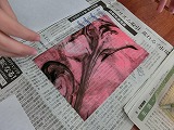 生徒たちは、水溶液に絵具を落とした後、竹串で模様を描いて紙に転写する作業を意欲的に行い、大理石のような幻想的な模様を作り上げていきました。