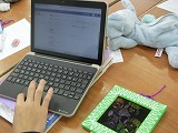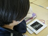 自分の作品をタブレットで撮影したり、紹介文を入力したりして、鑑賞カードにしています。
