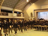 全校生徒が体育館にいすを並べ、卒業生入場から退場までを通して練習しました。