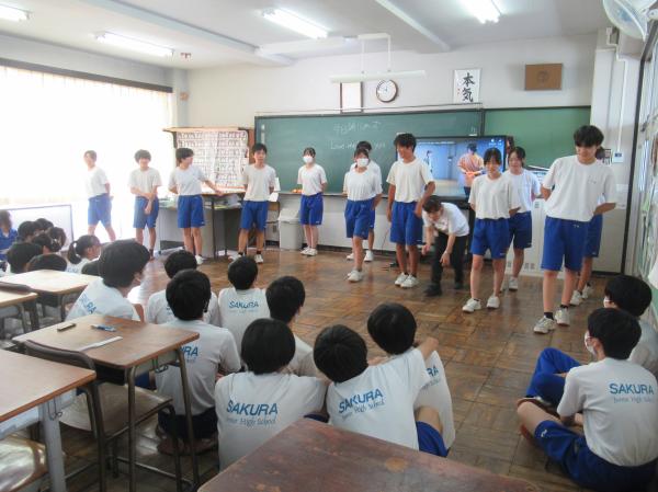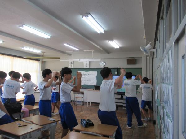 学校全体での体育祭練習が始まりました。初日は雨ということで、どの団も教室や体育館等での応援練習が中心だったようです。9年生の団役員が中心となって、練習に意欲的に取り組んでいました。