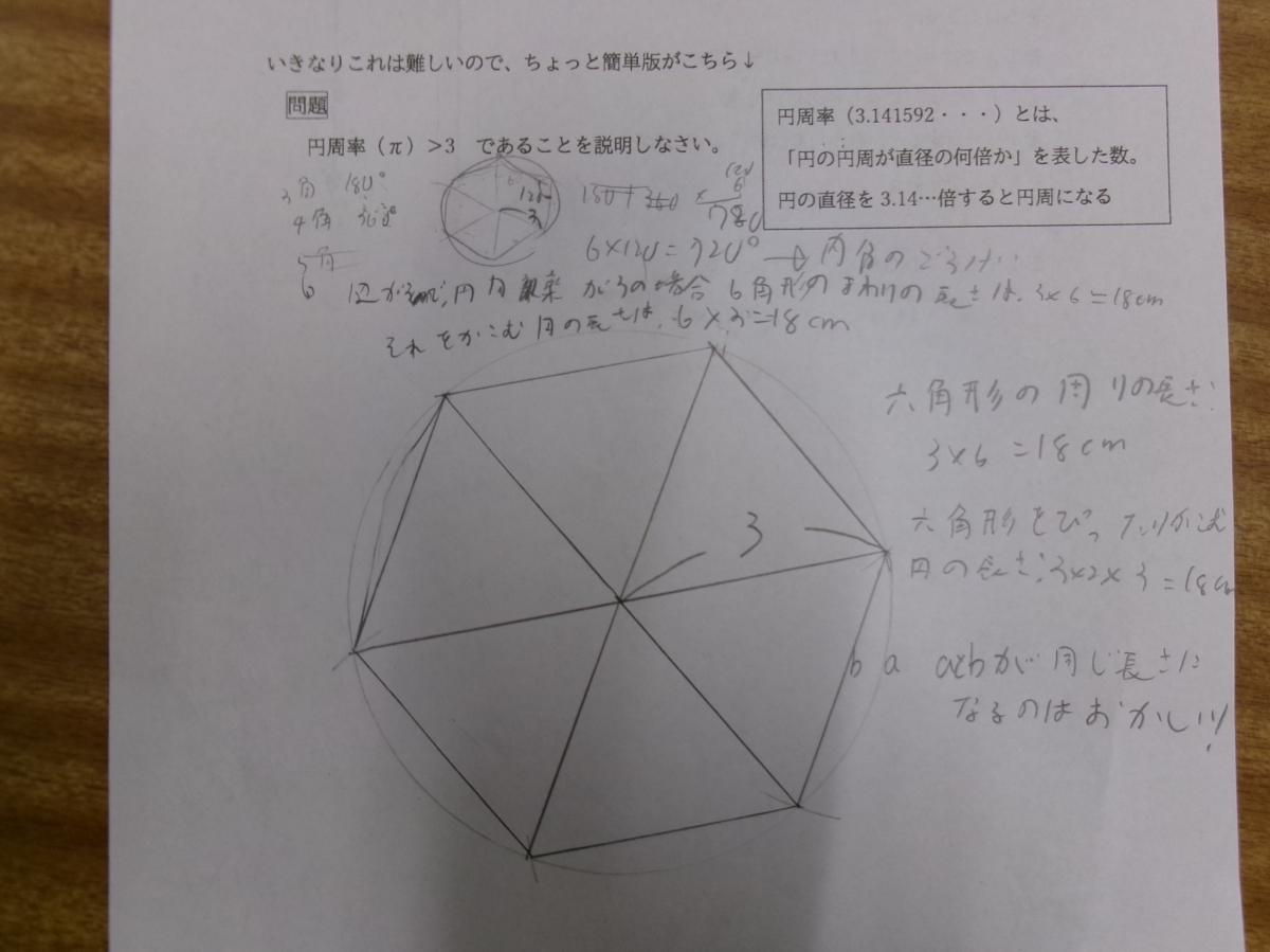 本日の数学では円周率が3より大きいことを図を使って説明したり、日本地図の都道府県を塗り分けるためには最少で何色使えばよいかを実際に色を塗りながら考えたりしていました。