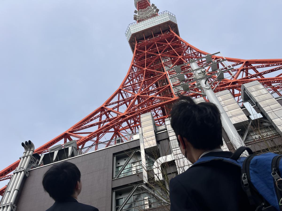 東京タワーに着きました。 間近で観る大きさに驚いていました。 これから全員で展望台に向かいます。