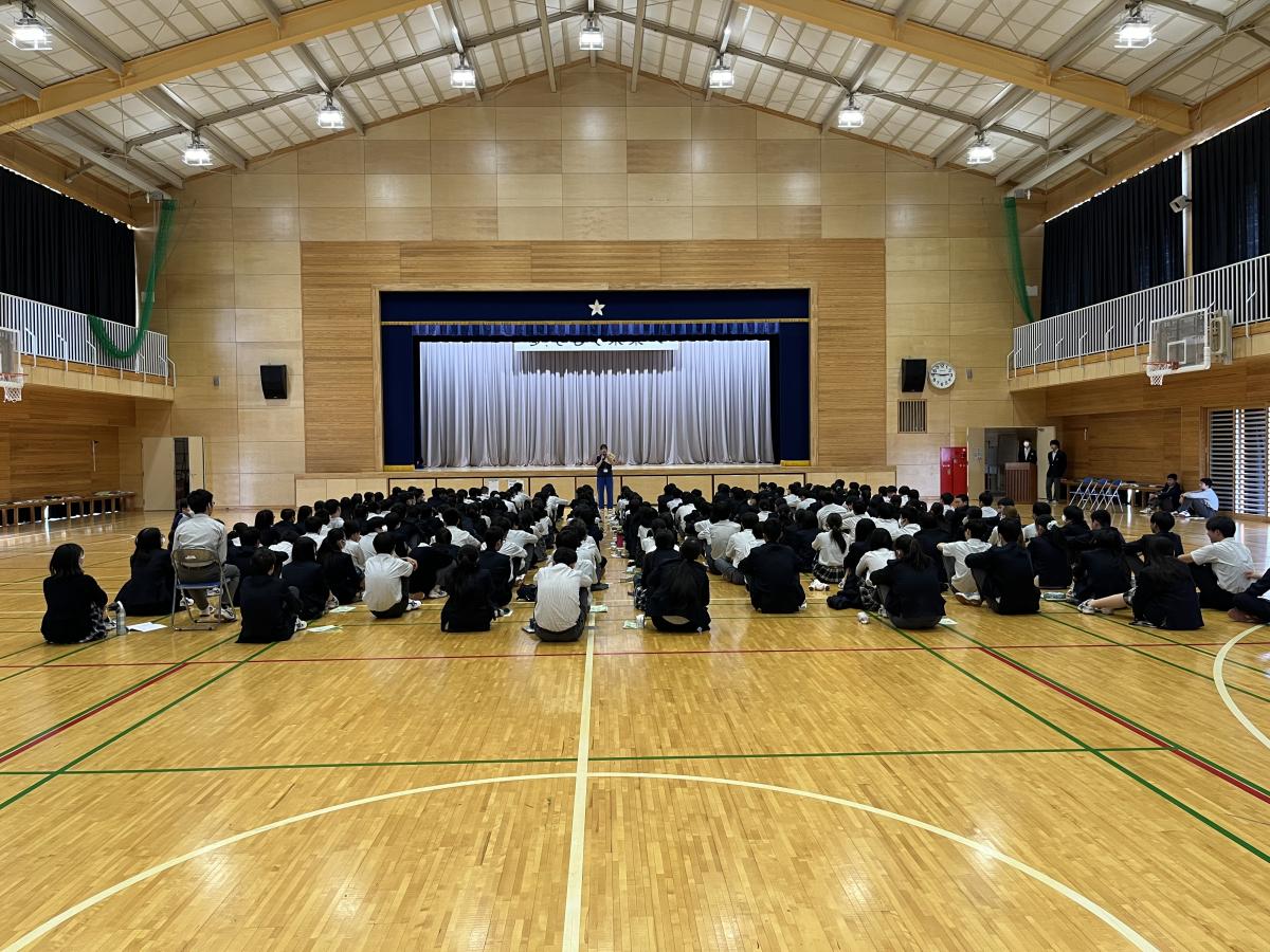 6校時に体育館で実施しました。 実行委員長からは、楽しさの中にも学びのある修学旅行にしようという話がありました。 また、スローガンである【Connection of …】にあるように、いろいろなものと繋いでほしいと思います。
