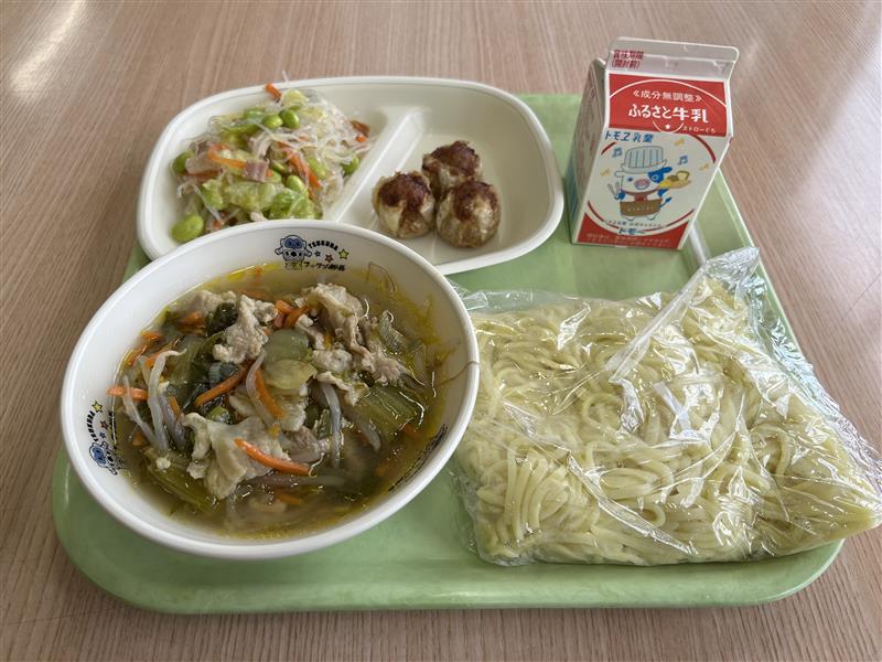本日の献立は、福来ラーメン、牛乳、あげしゅうまい、春雨サラダでした。