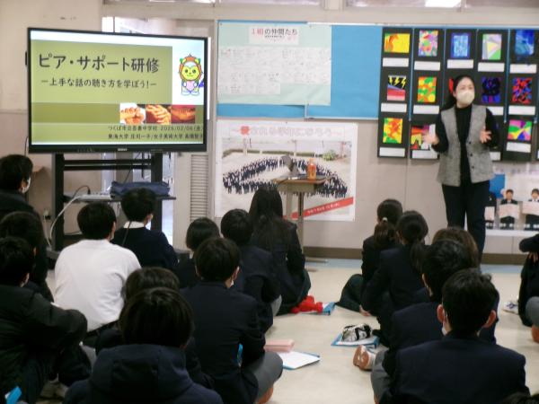 本日、5・6時間目に、東海大学の庄司先生、女子美術大学の高橋先生をお招きして、7・8年生を対象にピアサポート講座を行いました。先生方は筑波大学にいらっしゃった頃から、ずっと吾妻中学校のピアサポート活動のご指導をしてくださっています。5時間目は学年ごとに、6時間目は7・8年生合同で、上手な話の聴き方のトレーニング(傾聴)を行いました。