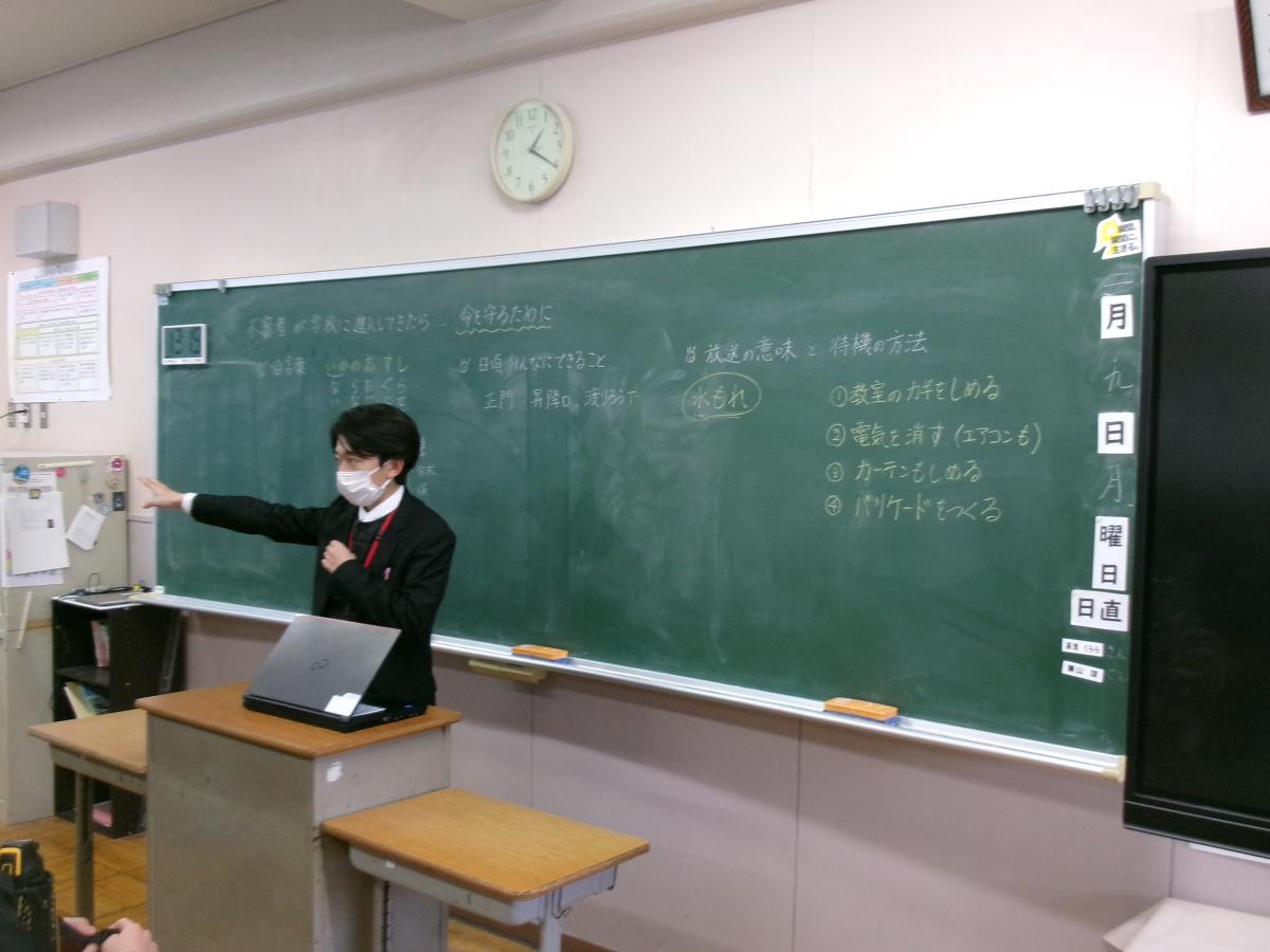 各教室で行い、緊急時の危険回避の具体的方法(避難の方法、避難の場所・経路・連絡・誘導
