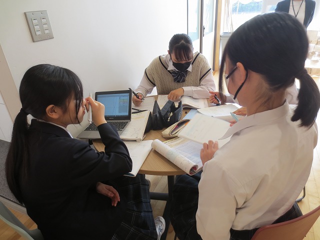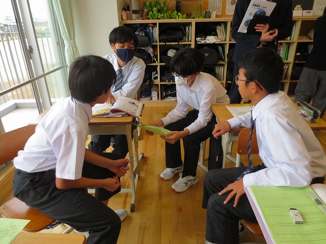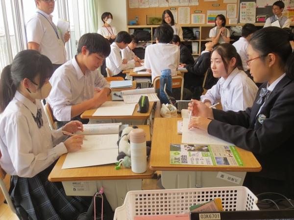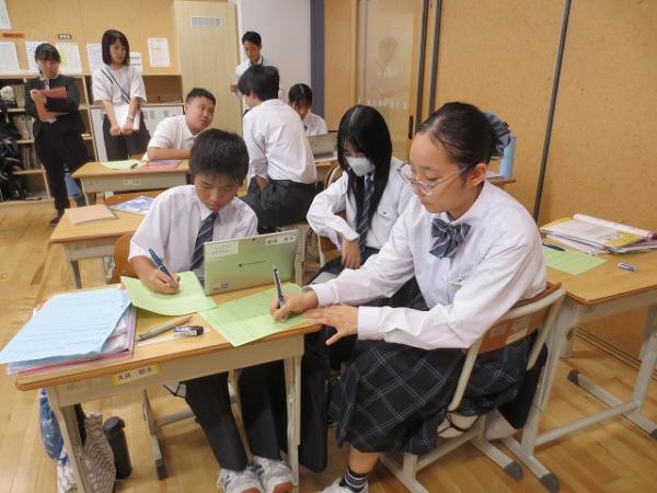 日本でホームステイする生徒に役立つ情報を考え、「おもてなしガイド」を作成しようということで、「Do’s and Don'ts」(すべきこと・してはいけない)という視点から英文をグループごとで考えていました。次の時間にはプレゼン動画を作成して見合います。