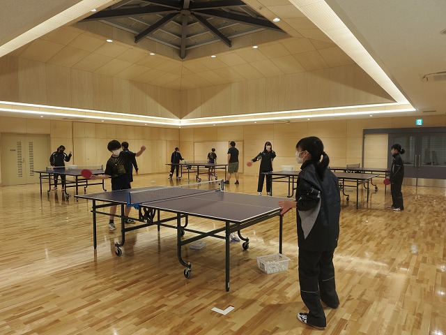 武道場では卓球部が活動していました。二人一組になり、打ち手(練習者)と送り手(球出し)を交互に行いながら多球練習に取り組んでいました。