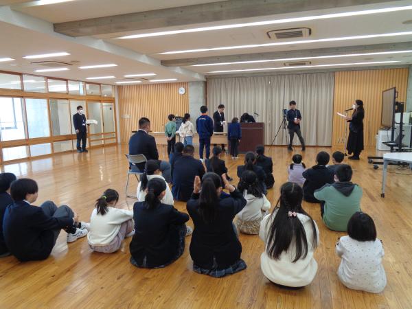 集会の様子は各教室に配信され、子供たちは各教室で映像を見ました。