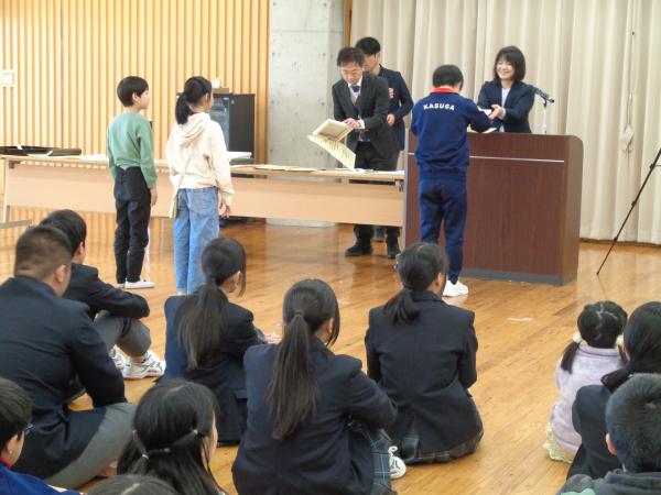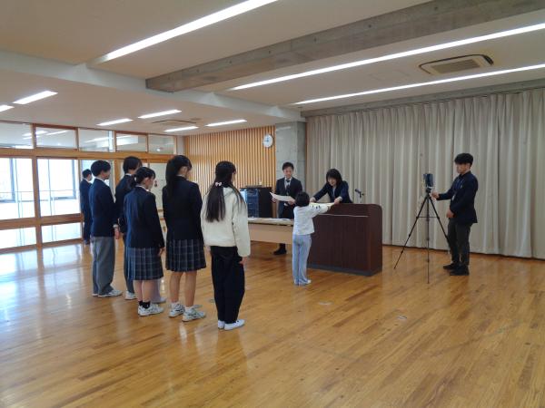 次に、旧児童生徒会本部役員から新生徒会本部役員への引継ぎ式が行われ、令和7年度児童生徒会役員には感謝状を、令和8年度児童生徒会役員には任命書が授与されました。