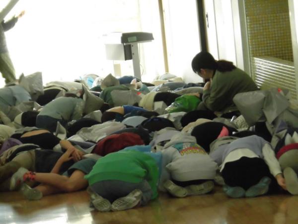 子供たちは防災頭巾やヘルメットを被り、避難場所へ避難し、避難の姿勢(ダンゴムシのポーズ)をとりました。