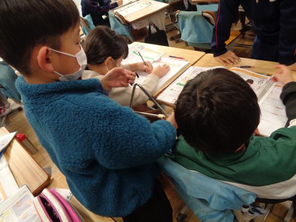 付箋を貼ったトライアングルをたたき、付箋の様子をグループで調べました。