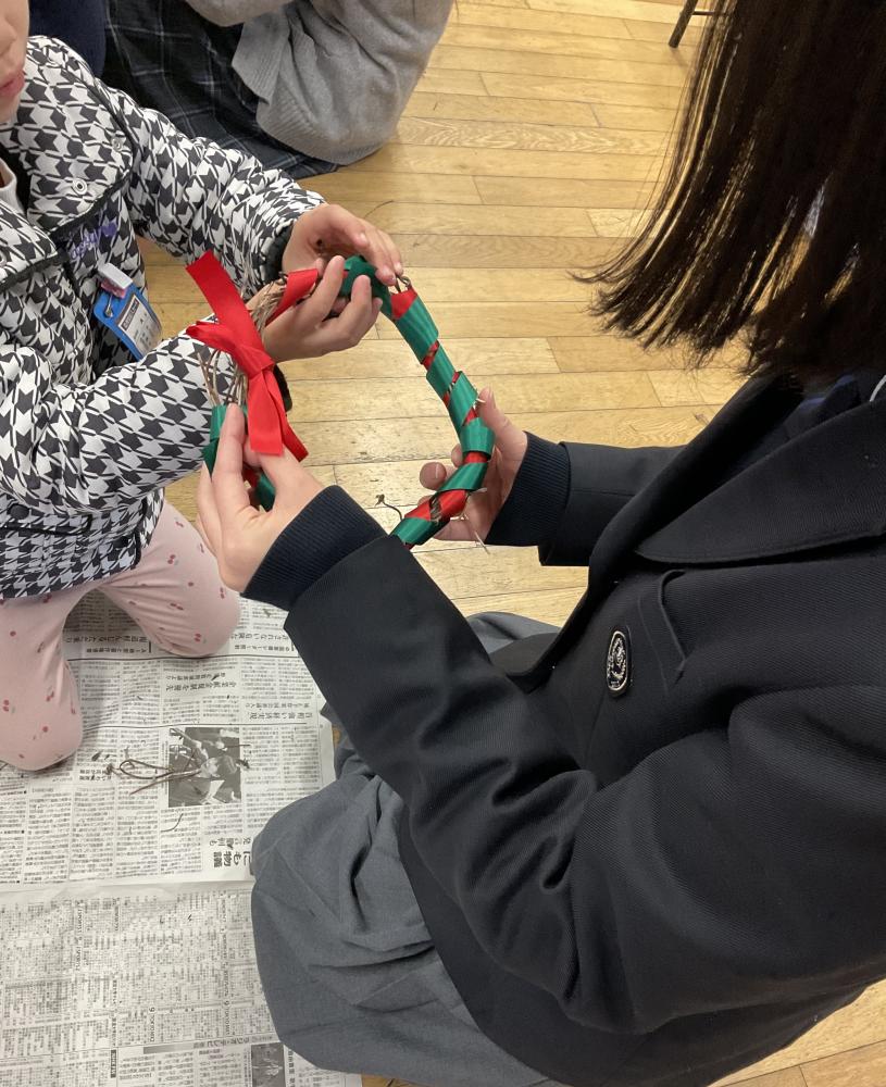 リボンの色やリースの大きさをペアの8年生と相談しながら、思い思いのリースが完成しました。
