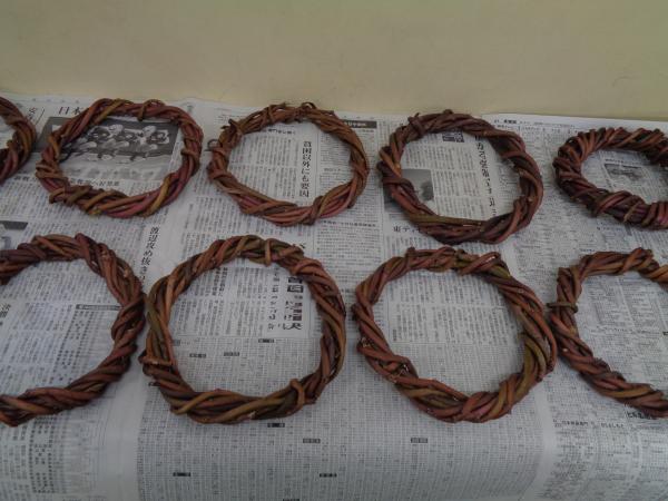 サツマイモのつるを丸い形に巻いて整え、飾りを付けていきます。