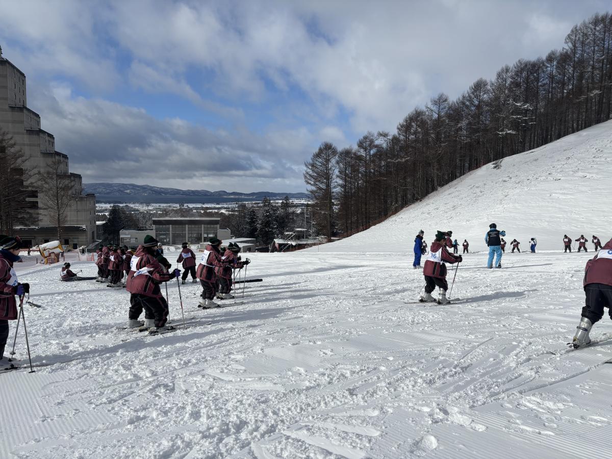 横滑りから徐々に距離を伸ばし、さらに下に向かって滑れるようになる姿がぐーんと増えてきました。前方に見える猪苗代湖に向かって滑る感じです。もちろんまだ、湖を見るほどの余裕はなく、とにかく滑ることに全集中‼️