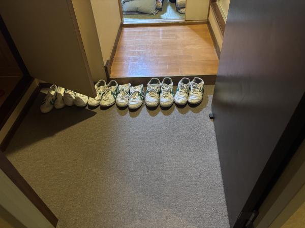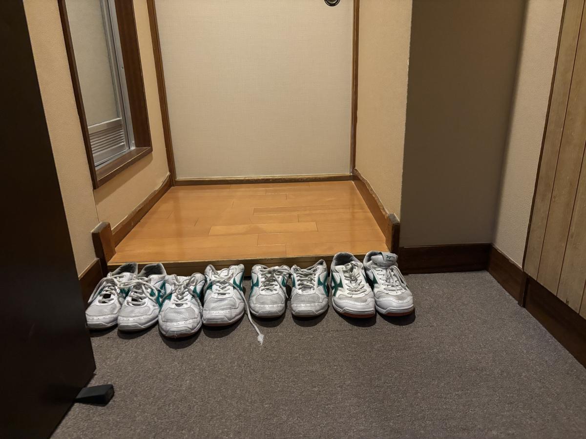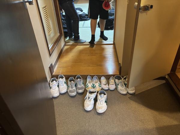 起床時刻の朝6時。脱いだ上履きがきちんと揃えてある部屋が複数見られました。