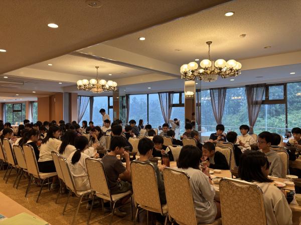 ホテルの方から「よく眠れなかった人?」「よく眠れた人?」の質問には、それぞれ数名の子が挙手。次の「宿の食事、おいしかった人?」の質問では、どっと手が上がりました。
