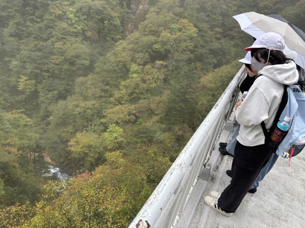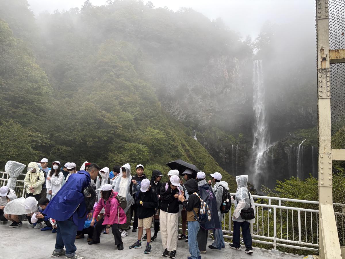 しかし、見学時には雨もほとんど降っているのが感じられないほどになり、滝もしっかり見ることができました。霧がうっすらとかかった幻想的な華厳の滝でした。谷の方を見ると、始まったばかりの紅葉が見られました。