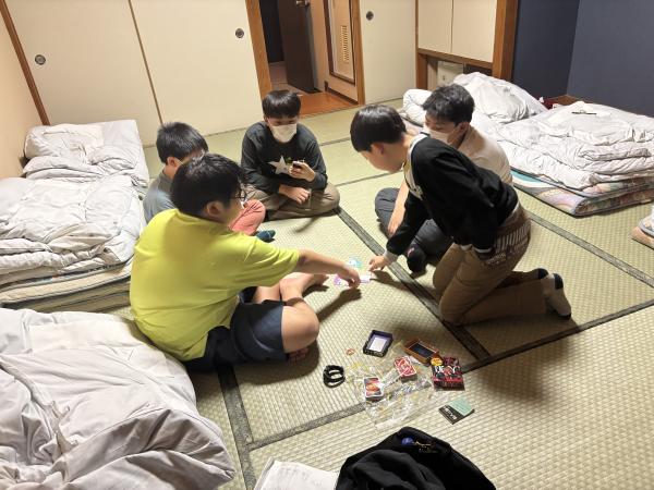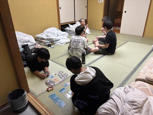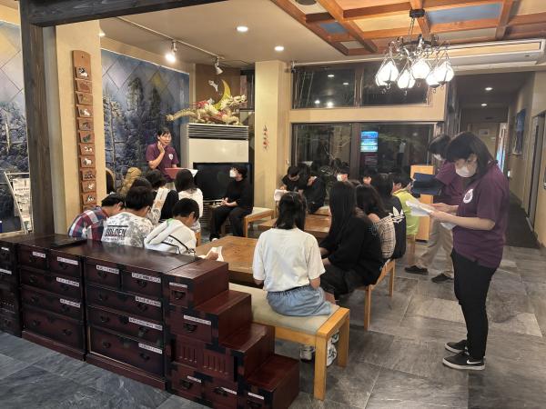 ホテル前の駐車場で入館式を行いました。万が一、大きな地震などが起きた場合、ここが避難場所であるとのことでした。部屋長会議をフロント前で行った後、部屋長が中心となりメンバーとともに避難経路も確認しました。
