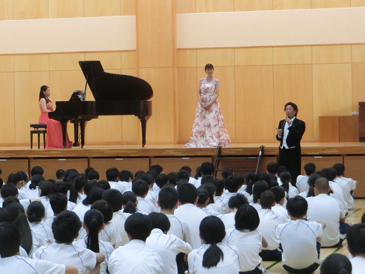 今年度もプロの演奏家である安田旺司先生、片岡未希子先生、松田みゆき先生を講師としてお招きして、7・8・9年生合同によるコンサートが開かれました。普段、なかなか聴くことができないプロの演奏家の演奏を近い距離で聴くことができました。生徒たちは、プロの演奏に惹きこまれるように聴き入っていました。