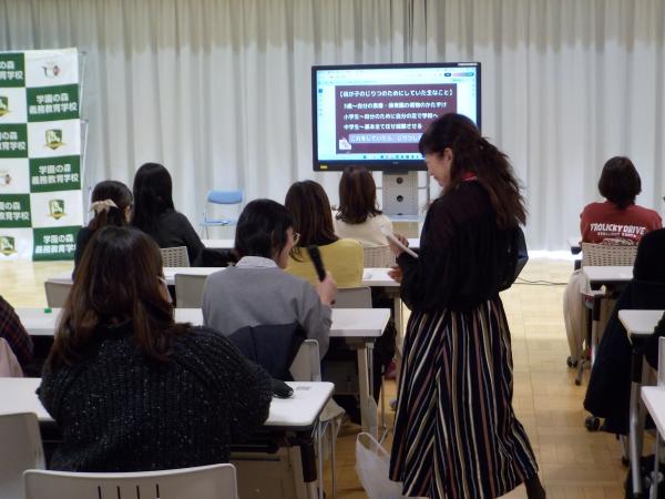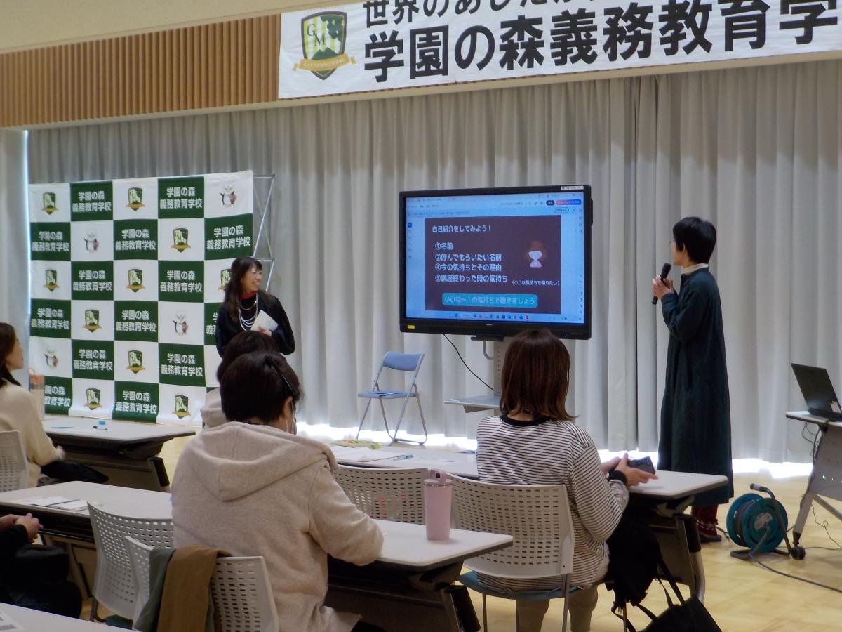 本日、1年生から9年生の保護者の方々を対象に、家庭教育学級を開催いたしました。日本親子コーチング協会マスターインストラクターコーチの飯村康子先生を講師としてお迎えし、「幸せな子育て~コーチング流コミュニケーション」という講演をしていただきました。楽しい実践を取り入れながら、日々の子育てに生かせるような大変有意義な内容となりました。