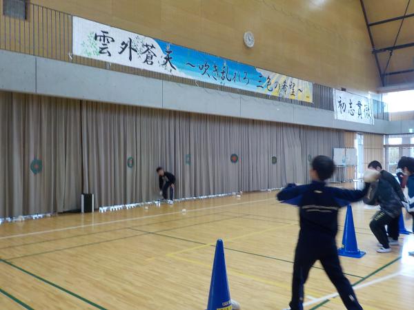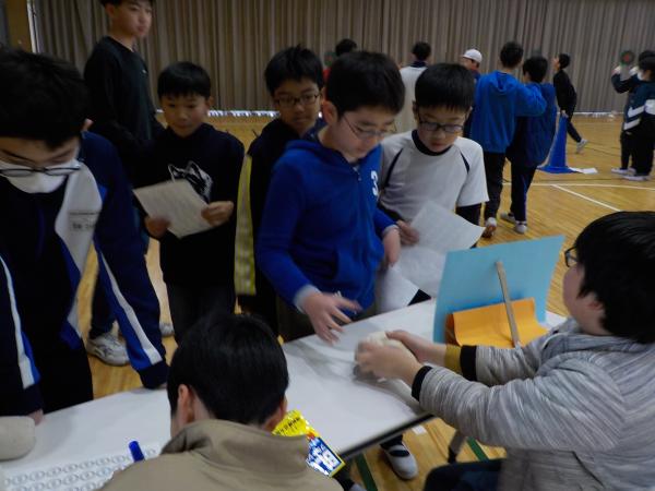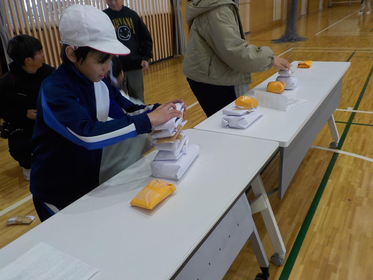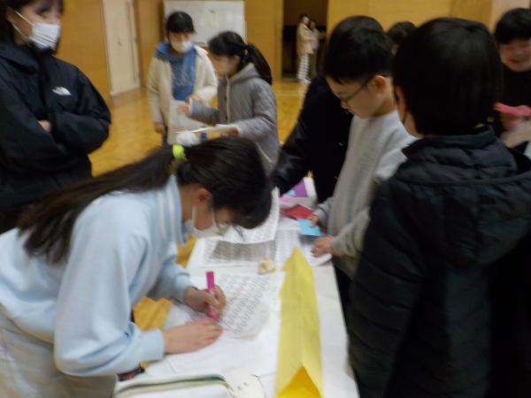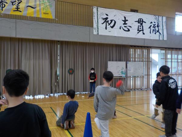 今回の学年レクは6組が主催です!冬祭りと題して、紙で作ったお餅やみかんを重ねる鏡餅バランスゲームや、雪玉に見立てたボールで的当てなど、様々なブースが用意されていました。各ブースで手に入れたポイントを景品となる折り紙やメダルと交換する様子が見られました。