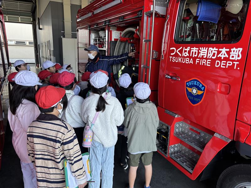 3年生は、11月27日、28日の二日に分けてつくば市中央消防署へ見学に行きました。実際の消防車や救急車を見たことがある人はたくさんいましたが、車の中を見るのは初めての人が多くいました。27日に見学したクラスは、実際の出動訓練の様子を見ることができました。28日に見学したクラスは40mのはしご車を実際に動かす訓練を見ました。どちらも迫力ある訓練で、貴重な経験になりました。