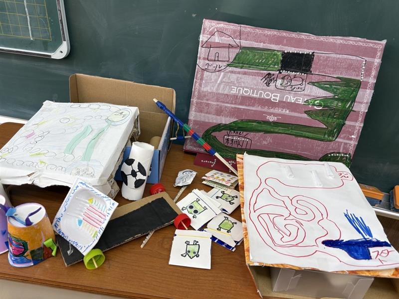 「どのように材料をつけたら良いかな?」「うまく動くかな?」と形になってきたおもちゃを動かしてみたり、改善したりしながら、楽しそうに活動する様子が見られます。どんなすてきなおもちゃができあがるのか、とても楽しみです。