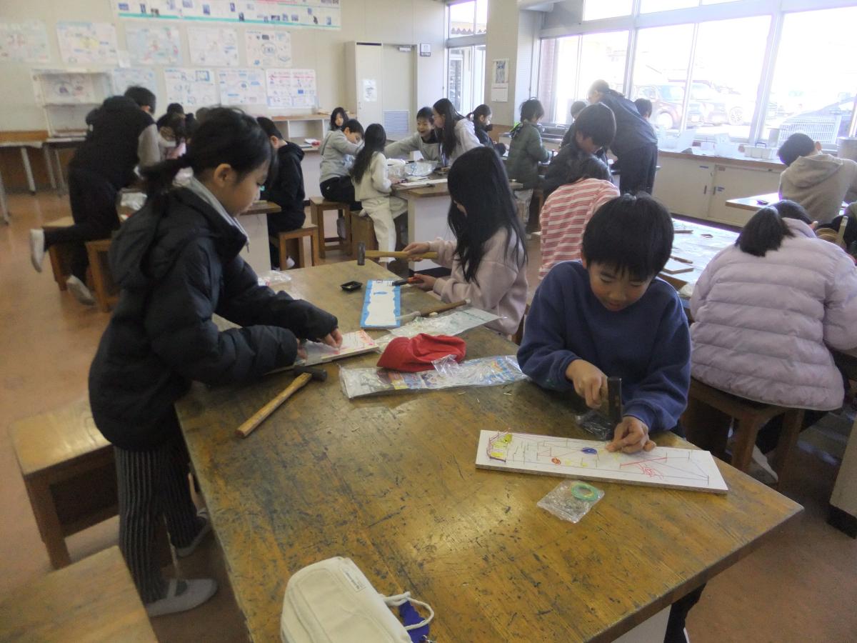 3年生の図工で、釘打ちの学習「トントンつないで(迷路づくり)」を行っています。初めて金槌を握る児童も多く、最初は慎重に打ち込んでいましたが、次第にリズムよく釘を打てるようになりました。釘の間隔を考えたり、輪ゴムを掛けてコースを作ったりと、工夫を凝らした迷路が完成しつつあります。教室中にトントンと心地よい音が響き、どの子も真剣な表情で作品づくりに没頭していました。