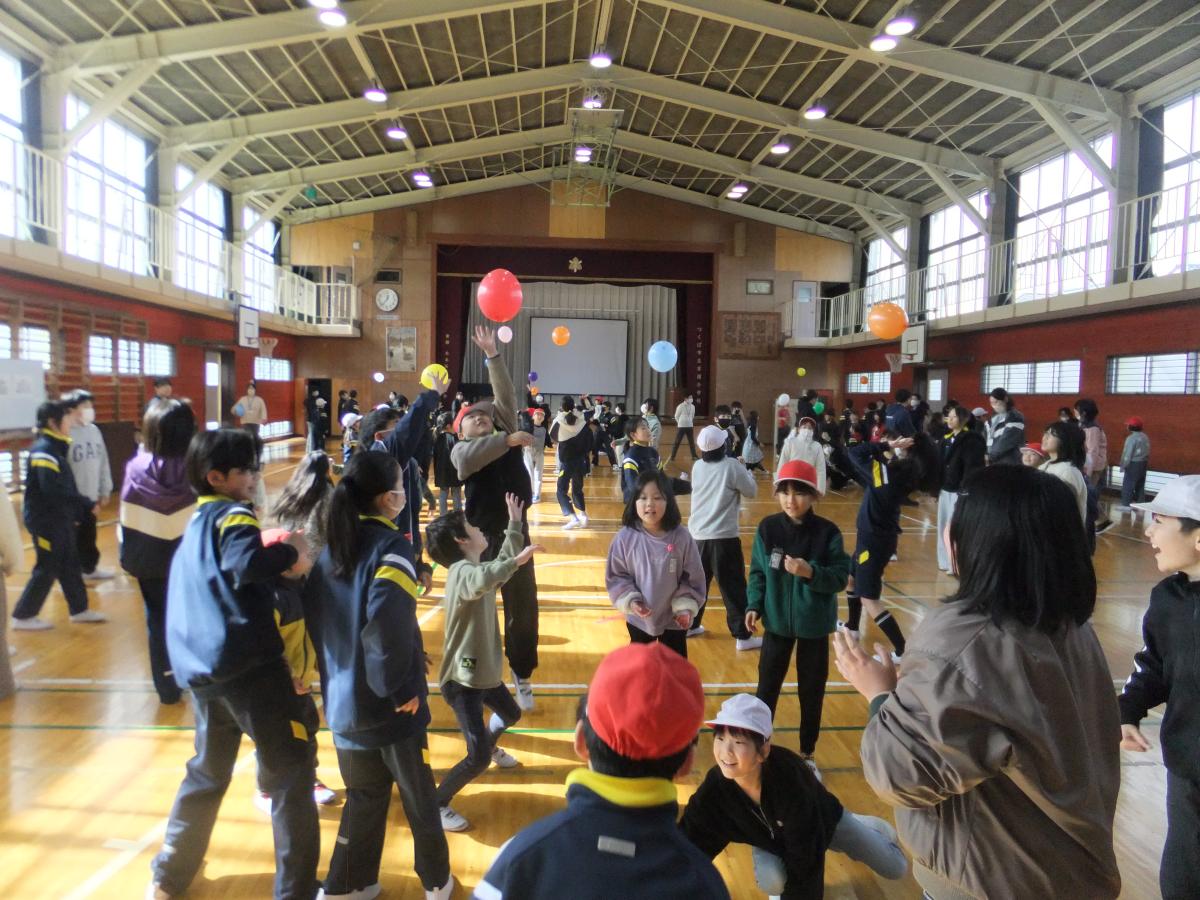 高学年が企画運営している「縦割り遊び」。今回は、各グループで「風船バレー」を楽しみました。ふわふわと動く風船を落とさないよう、上級生が下級生を優しくサポートしながら、笑顔あふれる時間を過ごしました。異学年との交流を通じて、思いやりの心や絆が一段と深まったようです。準備や進行を頑張ってくれた高学年の皆さん、お疲れ様でした!