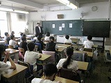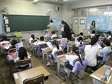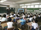 市内の農家の方を招いて、食育授業を行いました。ごぼうなどの作っている野菜の実物を見せていただき、使っている大型の農業機械や「シーダーテープ」についてなど、農業と食育を絡めた様々なお話をしていただきました。子どもたちは疑問に思うことなど、たくさんの質問をして、農家さんに答えてもらっていました。