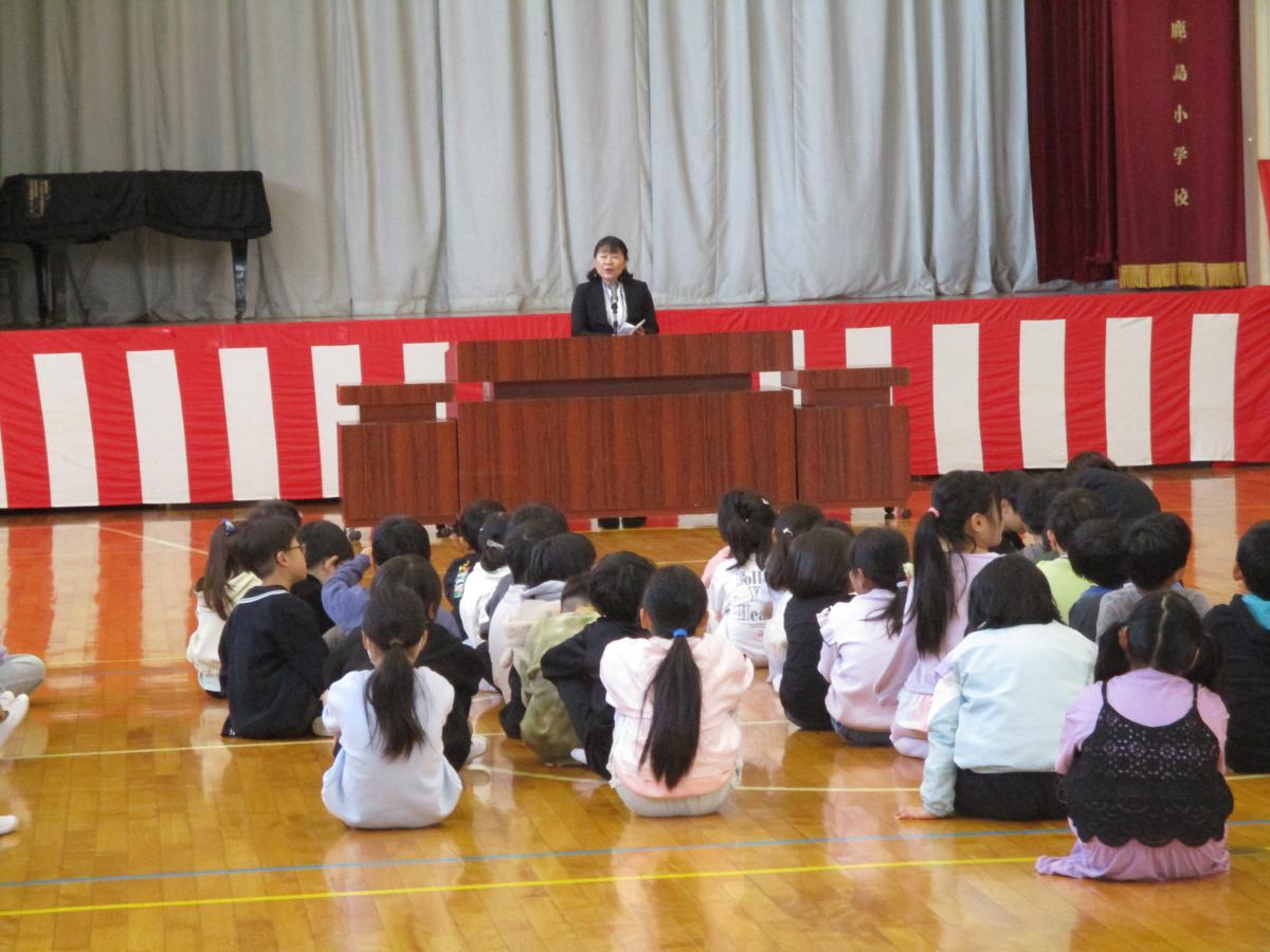 担任の先生の呼名に、元気に大きな声で返事をすることができました。また、5・6年生の歓迎の言葉を、しっかりと聴くことができました。今鹿島小の一員として、みんなと仲良く小学校生活を送ってほしいと思います。