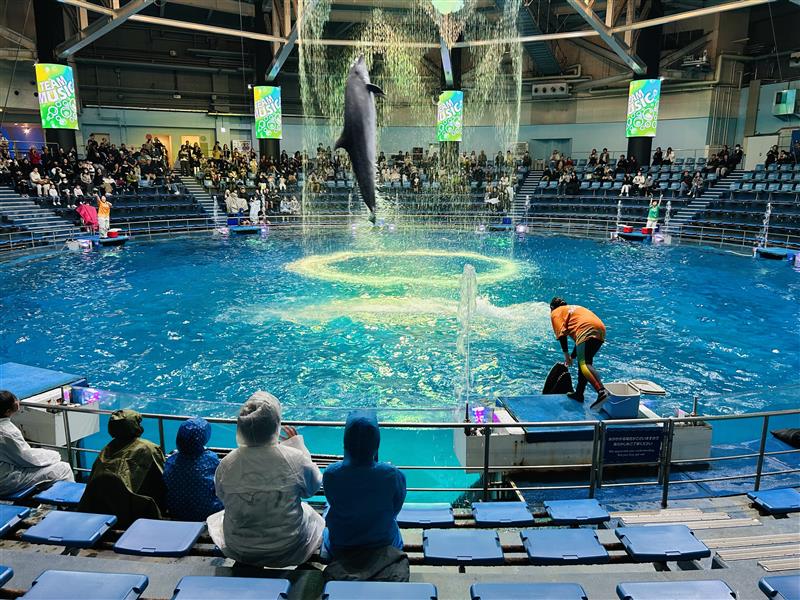 音楽と光の演出が魅力のイルカショーを楽しみました。イルカのパフォーマンスや水かけが迫力があり、圧倒された6年生でした。