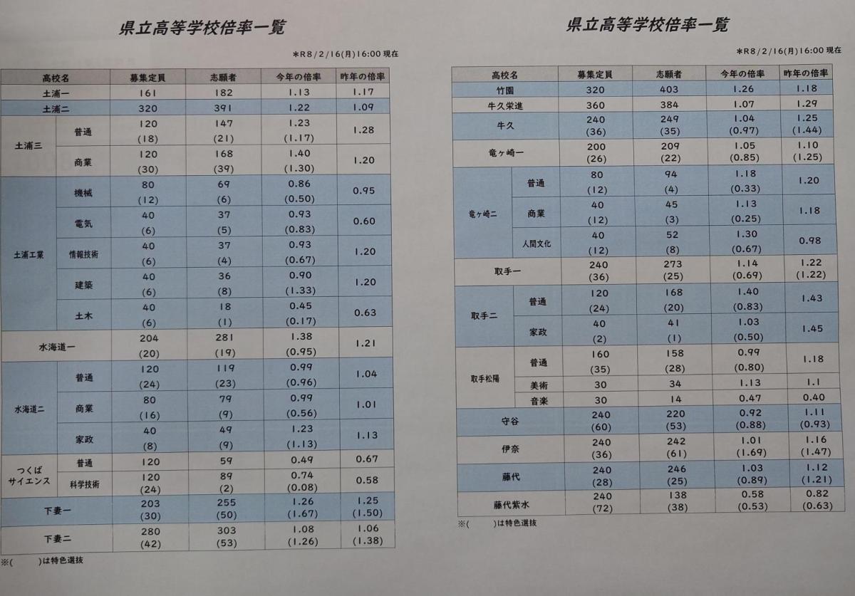 本日16日と、明日17日は、茨城県立高等学校の志願先、志望先変更期間となっています。2月9日と比べて倍率が増減している高校が多々見られますので、詳しくは各高校のホームページにてご確認ください。