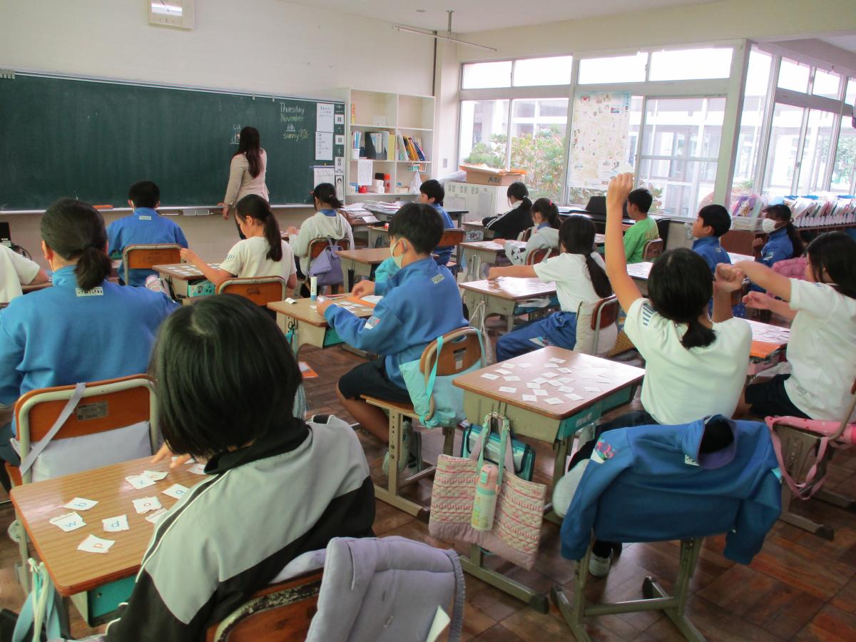 2学期から新しいALTの先生になり、外国語活動の時間にアルファベットの学習をしています。アルファベットが書かれたカードを使いながら、catやdogなど短い単語を作ってアルファベットに親しみました。