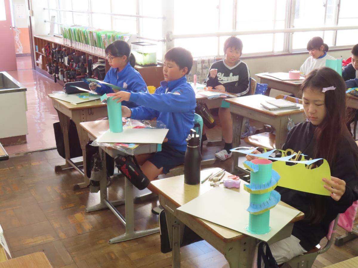 現在、5年生の図画工作では「ビー玉大ぼうけん」という題材をとおして、コースを作る楽しさを味わいながら学習を進めています。子供たちの豊かなアイディアで、ビー玉が大冒険を繰り広げる場に変わっていきます。どんなコースができるか楽しみです。